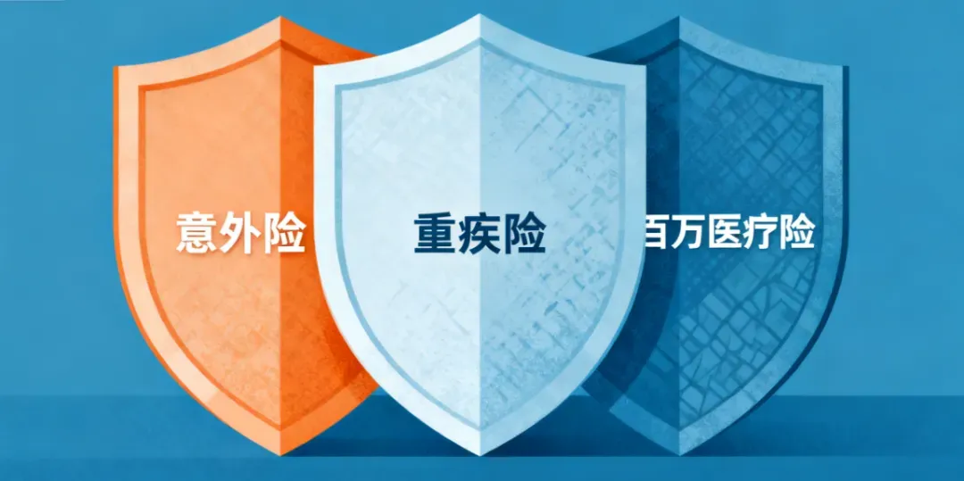 百万医疗险解决医疗费用问题,重疾险弥补收入损失和康复费用,意外险则提供专门的意外伤害保障。