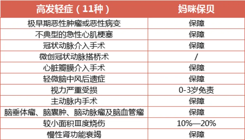 11种高发轻症,覆盖10种。缺少的微创冠状动脉搭桥术,这里有保障冠状动脉介入手术,两种均是针对心梗的治疗方式,没什么问题,毕竟有保障不典型心肌梗塞。