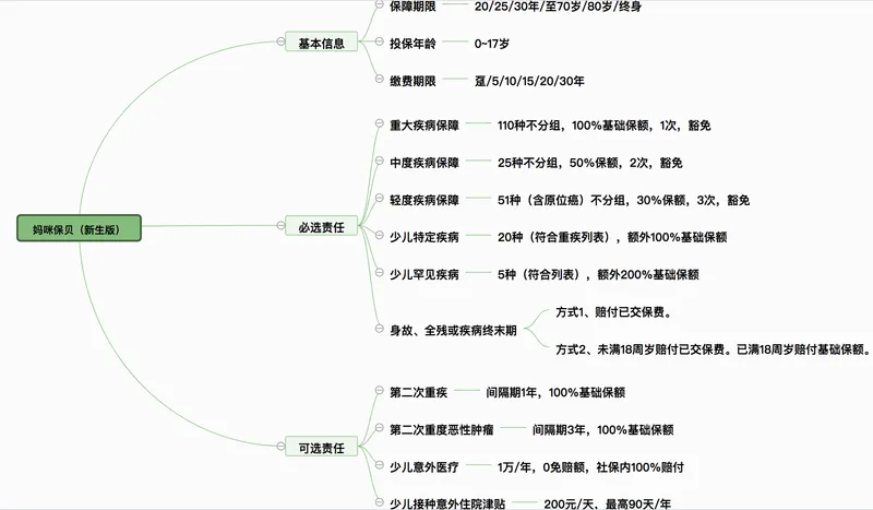 妈咪保贝(新生版)还加入了特定疾病的赔付,20种特定疾病额外赔付100%,5种罕见病,额外赔付200%。且这两项保障,是产品本身的责任,不需要附加选择。