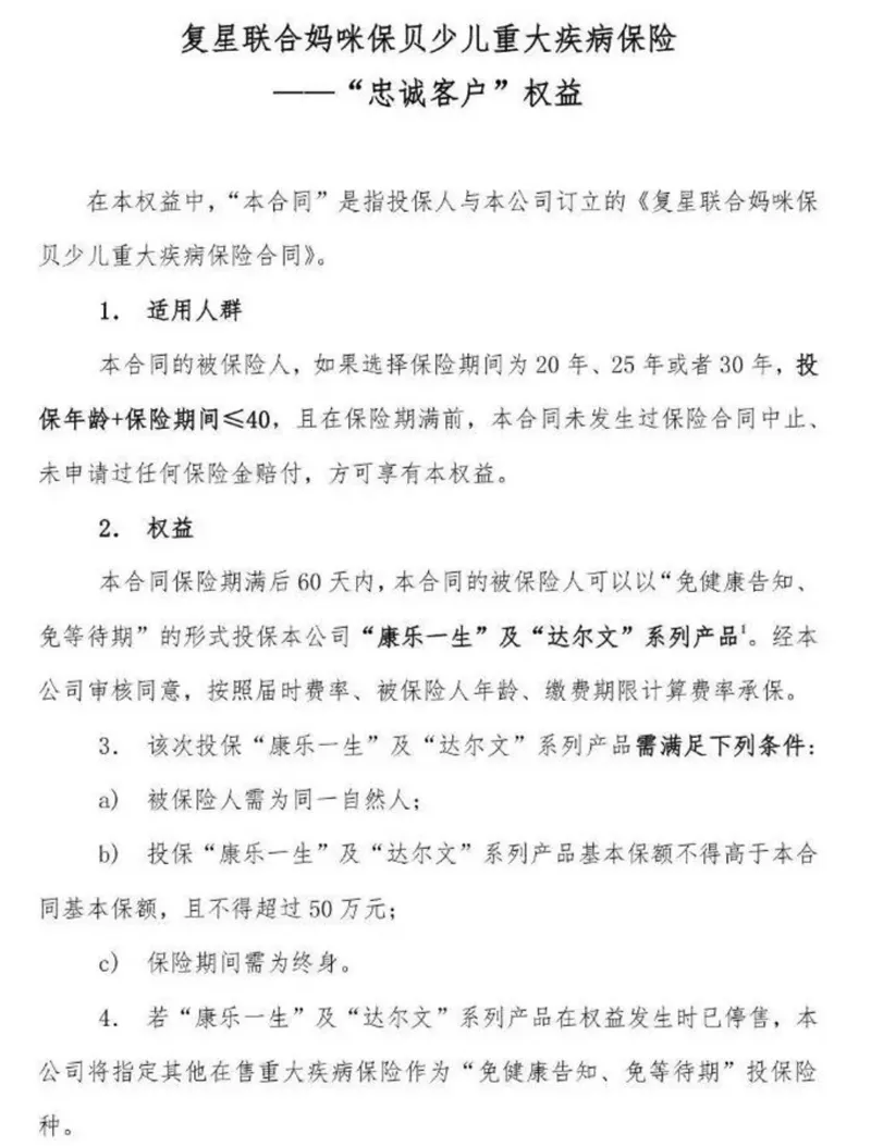 不过复星联合公司也考虑到这一点,增加了一项“忠诚客户”权益服务,在妈咪保贝合同保障期间届满之前,可以免健康告知投保复星联合的终身型重疾险。