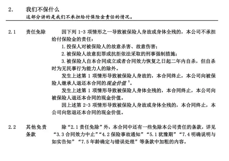 责任免除则是专门来约定什么情况下身故不赔付的,当然也是限制越少越好。